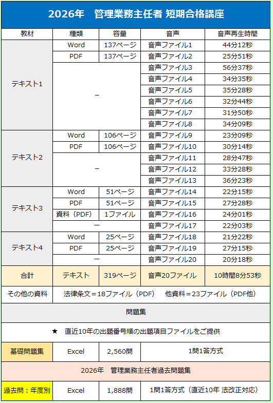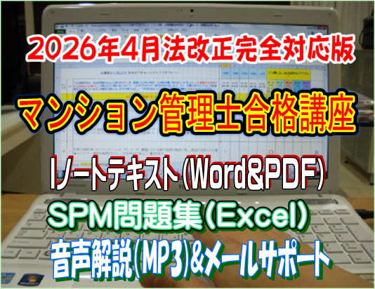 マンション管理士試験も管理業務主任者試験も、マンション管理のスペシャリストを誕生させるための難関国家試験です。 確かに合格率だけを見れば難関ですが、勉強の仕方一つ変えるだけで成績・成果は飛躍的にアップします。 当事務所のIノートテキストとSPM問題集は、マイクロソフト社のワード、エクセルおよびPDFファイルから構成されています。 パソコンを使って学習していきますが、その操作はいたって簡単。複雑な操作はありませんので60歳、70歳代の方からもたくさんのご注文をいただいております。 特に過去の出題を徹底分析して作成されたSPM問題集は、すべてが1問1答式になっており、それぞれの設問について、必ず「正誤判断」を求められます。 これにより、知識の取りこぼしを防ぐことができるのです!! 最近の出題傾向では、「以下の設問の中に正しい(間違っている)ものはいくつあるか?」といったものが目立ちます。 「どれが正解か?」なら消去法という手もありますが、「いくつあるか?」ですと、すべての設問に対する知識が無ければ対処することができません。 しかし、普段から1問1答式問題集で訓練している方なら、このような問題も難なくクリアできます。 また、SPM問題集は、設問−解答−解説がすべて横並びに配置されているため、記憶力アップにもつながります。 設問、解答、解説が離れた位置に配された問題集では、あなたの集中力は極度に損なわれます。 目の眼球移動は集中力、記憶力と密接な関係があるからです。 難関試験に合格するためには専門スクールに通わなければ無理だと言う人がいますが、それは全く違います。 スクールに通わなくても、高額な通信教材を購入しなくても、勉強方法をちょっと工夫するだけで、合格圏に入ることは可能ですし、短期間で合格することもできます。 特に時間が無い人ほど、限られた時間の上手な活かし方を考えるべきです。 ダラダラ長時間かけて勉強しても、高額な教材を購入しても合格できない人は、数えきれないほどいます。 しかし、この試験は自宅学習で十分、合格できますし、費用もかけずに合格できるのです。 現に毎年、Iノート&SPMを使って合格される方が大勢います。合格者の中には60歳以上の方も数多く含まれております。 年齢を重ねることで記憶力が減退するという通説も、脳科学的には無いそうです。 暗記力と記憶力は異なります。記憶力には「理解」が伴います。マンション管理士、管理業務主任者試験に求められる法制度に対する知識は、誰でも知っている内容が多く含まれています。 何故なら「住」に関する問題は、人として生きていく上で欠かせない要素だからです。屋根の無い空間で生活している人はほとんどいません。 「住居」があれば、意識せずとも自然と身についた建物知識もあるはずです。 あなたが既に身につけている一般常識にプラスアルファの専門知識を加えるだけで、「合格」はすぐに見えてきます。 Iノート&SPMは、一流のマンション管理士、管理業務主任者を教育するための教材ではありません。 あくまで、「試験に合格するため」だけを目的に作られています。ですので、資格取得後に実務として必要な知識は記載しておりません。 それは試験合格に必要な知識と、やや異なるからです。 試験では実務に関するものは出題されません。求められるのは、法的な基礎知識です。 この教材は「とにかく、資格だけ先に欲しい」と割り切れる人にこそ、最適な教材といえます。資格を取得するには、試験に出る個所だけ正解できれば合格できます。 時間は有限ですので、限られた勉強時間はすべて、試験に出るところに注いでください。 資格を取得しなければ、スタートラインには立てません。このスタートラインとは、稼ぐための出発地点です。 資格を取得したら、稼いでください。 稼ぐとは、誰かの役に立つということです。求められる人のところには、自然とお金も集まってきます。 当事務所は、一人でも多くの方にスタートラインに立つための「切符」をお渡しできるよう、全力でサポート致します。 教材を売ったら終わり・・・ではありません。教材をご提供してから試験直前まで、共にあなたと一緒に合格を目指していきます。 <資料> 最近の試験では、下記のような問題が管理業務主任者試験では、なんと50問中12問も出題されています。 このような問題では他の肢との比較による消去法は通用しません。だからこそ、SPM問題集のような一問一答式で日頃から訓練するのが有効なのです。