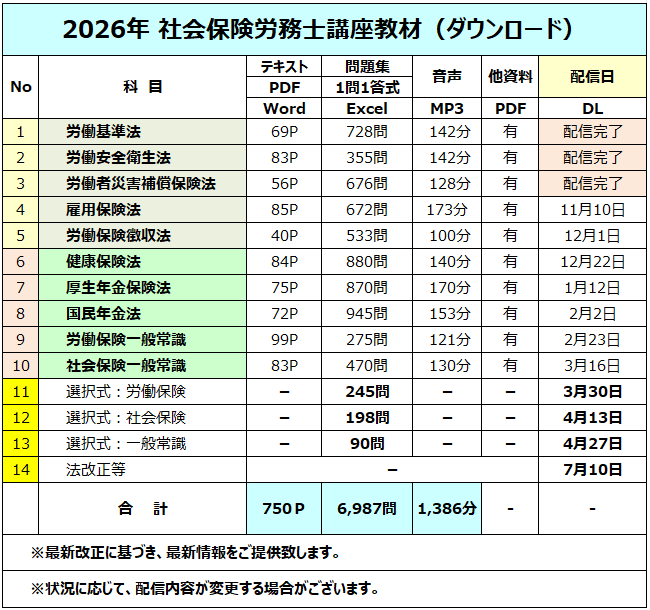社会保険労務士試験は、国家資格試験の中でも断トツに法改正が多い試験です。そのため、弊社では最新法改正を電子教材に落とし込み、約20日間間隔で科目ごとに配信しております。 電子教材は検索機能や履修済み内容の管理が容易で、記憶の呼び覚ましや資料類との照合にも便利な機能を多数、兼ね備えています。 市販参考書籍や手書きノートを利用していては、合格率6%の壁を打ち破ることは不可能に近いでしょう。 効率的に学習・能力管理をしていかない限り、合格レベルには達することができません。特に復習段階で無意味なことに時間を費やす方が非常に多くいらっしゃいます。 自分自身、何を理解できており、何を理解できていないのか・・・この選別が明確でない方は非常に危険です。 開始時期が遅かった方は少し苦労が伴いますが、急ピッチで追いつく努力をしてください。1科目10日以内の完了が理想です。 理解できない箇所は弊社に質問してください。復習期間の上手な確保が合格の秘訣です!!弊社の問題集は1問1答式。 是非、正解率90%以上を目指してください。合格をぐっと引き寄せることができます。 問題集で90%以上の正解率をキープできた方のほとんどが、合格されています。 試験用教材は最新の法改正等を記載したものを「労働基準法」から順次、約20日間隔でご案内していきます。 ダウンロードは簡単です。パソコン操作が苦手な方でも大丈夫。弊社のご利用者は10代〜70代まで幅広い年齢層の方達にご利用いただいております。 お使いのパソコンで弊社がご案内しますダウンロードページにアクセスしていただき、ページに記載された案内にしたがって、お使いのパソコンにダウンロードしてください。 一度、ダウンロードされた商品はお客様ご自身で削除しない限り、パソコン内にずっと保存された状態となります。 教材は、PDF/Wordテキスト、Excel問題集、MP3音声解説、各法関連資料(PDF)から構成されています。教材の編集は自由自在です。 原本をそのままご提供しますので、加筆やコピー、貼り付けなどができます。ご自身にとって、一番、理解しやすい方式にぜひ、変えていってください。 ご購入いただきましたお客様は、無料かつ回数無制限で、弊社にメールにてご質問いただくことができます。 試験に関する相談も受け付けています。勉強方法などでお悩みなら、是非、ご相談ください。 また、勉強中にご理解できないことがあれば、迷わず、お気軽にご質問してください。迷ったら放置しない!ということが、短期合格の秘訣です。 ※ご注文&ご興味ある方はこちらから→ ![]() |