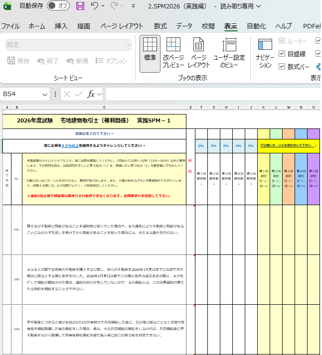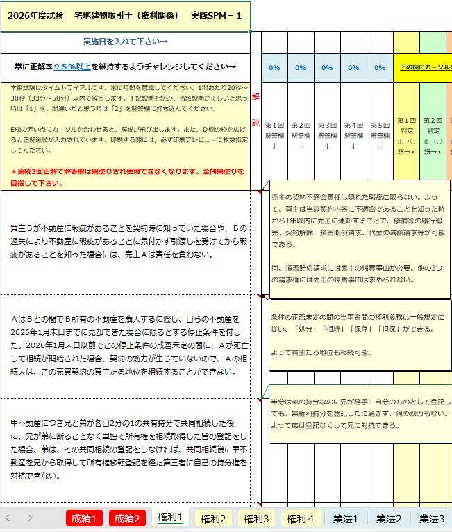 短期合格教材「Iノートテキスト」と「SPM問題集」は、Microsoft社のWordとExcel および、Adobe社のPDFファイルで作成されています。 テキストを解説した音声(MP3ファイル)も付いています。講師による直接指導は、メールを介して受けることができます。 講師である井真井が、19日間で合格するために作り上げた教材です。 正直、合格だけを目的に作った教材ですので、試験に合格することだけを目的とした人に使っていただきたい教材です。 Office(Excel,Word)搭載のPC等であればご利用いただけます。互換ソフトでも可能です。ソフトが入っていない場合には、弊社までご相談ください。 ![]() ![]() ダウンロード商品、またはダウンロード商品と同一のファイルを収録したCD郵送商品のどちらかをご選択いただけます。 ダウンロード商品をお申込みいただき、決済が完了しますと、ダウンロード専用ページ(URL)を、ご注文時に記載いただいたメールアドレス宛にご案内いたします。 お客様のパソコン等に直接、ダウンロードページから商品をダウンロードしてご利用ください。 この教材をお求めいただいた後は、独学ではありません。ご不明な点は、ご質問いただくことが可能です。 ![]() テキストには直接、書き込みが可能です。 検索機能などの便利機能も満載です。編集加工も自由自在。加筆はもちろん、覚えた個所は削除したり、覚える個所を太字や拡大することもできます。 自分に最適なオリジナルテキストに加工できます。 「私がつくるテキスト」=「Iノートテキスト」と呼びます。 テキストには、学習しながら容易に確認ができるよう、各省庁などが作成したパンフレットやリーフレットなどに簡単アクセスするためのリンクが数多く設定されています!! 最新の正確な情報を入手できるだけでなく、煩雑な確認作業を短時間で行うことができ、タイパに優れています。 調べたい個所に瞬間移動できる検索機能付き。 ![]() Excelで作成された「SPM問題集」は、今日まで数多くの宅建士を誕生させてきた実績のある問題集です。 一問一答式で作成され、基礎問題だけでも1,600問あります。 半世紀以上にわたり実施されている宅建試験において、あらゆる問題パターンを網羅した最強ツールです。 合格に特化した問題集であり、合格に必要な知識が迅速に習得できるため、『speed masters』と『supreme method』から「SPM」と名づけました。 使い方は簡単です。 問題文を読み、正しいと判断した時は、解答欄に「1」を、間違っていると判断した時は、解答欄に「2」を入力するだけです。 その判断が正しければ「○」、誤っていれば「×」が表示されます。 あなたがどの問題を正解でき、どの問題を誤ったかが一目瞭然 苦手個所の把握ができますので、復習時間をどの問題に費やすのが最善策なのかが、わかります。 一問ごとに正確な理解が求められるため、どんな応用問題で出題されても対処できるようになります。 1日に同じ問題を3回繰り返すことを推奨しています。 それにより、記憶の刷り込みができ、長期間にわたり、記憶し続けることが可能となります。 せっかく、覚えても、忘れてしまったら意味がありませんので、記憶からの喪失防止のために、必ず同日、同問題を3回、繰り返してください。 問題の右隣セルにカーソルをあてると、解説が飛び出してきます。 解説は、一問、解くごとに確認するのではなく、一定数の問題を解いた後に、間違った個所のみ確認してください。 最初は正解できなくても構いませんし、気にすることもありません。 自分はどのような問題が得意で、どのような問題が苦手なのか? これを把握できた人が、合格の見込みがある人です。 <何度も復習できるExcel ファイル式問題集SPM> ![]() <問題-解説の最強一問一答式:記憶力アップ> ![]() 連続3回正解で解答欄が黒塗りに。そのような問題は復習回数を減らしても大丈夫。総合点アップのためには、黒塗りできていない問題を中心に復習します。 ![]() SPM問題集は、次のステップを順番に踏んでください。 1・設問が正解なのか、誤りなのか、判断できるようにする。 2・設問が何故、正解(不正解)なのか、判断根拠を確認する。 3・解説を読んで、理解を深める。 4・自分にとって正解するために必要なことを書き込む。 5・連続3回正解できるようにする。 設問 ⇒ 解説 ⇒ 解答 ⇒ 正誤判断 といったように、各問ごとにすべて横一列に配置されています。これが集中力を持続させ、記憶力を増幅させます。 問題文とのリンク性が強くなるため、頭の中の整理も容易になります。 勉強で大事なのは、『覚えること』と『忘れないこと』。 これを同時に満たす勉強方法が、SPMです。 ⇒ 講座のお申し込み&価格確認はこちら |