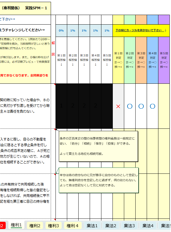 100人中15人しか合格できないということは、30人クラスならクラスで上位4位以内に入れなければ、合格できないということです。 あなたは中学・高校時代、クラスの中で何位でしたか? 4位以内に入っていましたか? こういう競争試験でライバルたちと同じような勉強をして合格するには、ライバルたちより2倍、5倍、10倍の努力が必要です。 ですが、・・・ ライバルと違う勉強法の実践を決断できれば、上位4位以内に入ることも難しいことではありません。 勉強法に対する発想を変えるだけで、合格が見えてきます。 最短で合格できる方法は、パソコンやタブレットなどので電子端末を使った勉強法です。 スマホでも良いですが、画面が大きい方が記憶が長く持続します。また、能力管理が容易ですし、検索や加筆・編集が簡単です。 私が、19日間で合格できたのも、学習にパソコンやタブレットPCを使ったからです。 ![]() 多くの方たちが仕事でも使用しているMicrosoft社のエクセル(Excel)とワード(Word)ソフトを活用し、初めての挑戦で、たった「19日間」しか勉強せずに、宅地建物取引士試験に合格できました。 もちろん、覚えるべき知識のターゲットの絞り込みが重要なのは言うまでもありません。 当時、私は関東最大規模の進学予備校(塾)の講師でした。 そのプロ経験を活かし、過去15年以上の宅建士試験出題データを徹底分析し、合格に必要なデータのみをWordやExcelに落とし込みました。 もし、あなたがアナログ学習を捨て、デジタル学習に切り替える勇気さえあれば、上位トップに入れる可能性は大きく拡がります!! 今の時代、パソコンが使えなければ、稼ぐこともできません。 ですので、この機会にエクセルやワードの操作方法も一緒に覚えて下さい。すごく簡単な操作ですので、どなたでも、できるはずです。 紙教材は大きなデメリットを抱えています その最たるものが、自己の理解度を認識できない点です。 実際の試験形式と同じ四肢択一式問題集を使って勉強している人は、今すぐやめてください! 近年は組合せ問題や個数問題の数が増えています。 四肢択一問題では、正解肢に該当しない他の3肢が、別の年度の試験で出題されることも多々あります。 全肢について、・・・ 正しいのか? 間違いなのか? その根拠は何なのか? それが、明確に言えないようでは、本番試験で失敗します。 それが、四肢択一式問題集を使っていると、正しく理解したかどうかの自己判断が難しいのです。 独学では、間違った解釈で、わかったつもりになってしまいます。 これこそが、独学者の陥りやすい危険な罠!! そして、独学している人の多くが、参考書籍に記載の赤字や太字の文字をノートへ転記する作業に励んでいますが、それは「作業」に過ぎません。 作業時間を勉強時間だと勘違いしている人が大勢いらっしゃいます。 例えば、頻出する「債権の譲渡」というテーマにつき、市販テキストのほとんどが以下のように説明しています。 債権は譲り渡すことができる。ただし、性質がこれを許さないときはこの限りでない。当事者が債権の譲渡制限の意思表示をしたときも、債権の譲渡はその効力を妨げられない。しかし、譲渡制限の意思表示がされたことを知り、または重大な過失により知らなかった譲受人その他の第三者に対しては、債務者は債務の履行を拒むことができ、かつ、譲渡人に対する弁済その他の債務を消滅させる事由をもってその第三者に対抗することができる。 このような抽象的な内容をノートに書き写しても、試験で具体的(登場人物ABC)な事例で出題されたとき、あなたは対処できますか? 「債権譲渡の性質が許さないとき」とか「譲渡制限の意思表示」って、どんなことを指すか、わかりますか? 試験に出ない情報や知識を覚えても意味がない!! 使えない武器をかき集めても、勝てない!! 市販テキストを購入してきて、別冊ノートに赤字や太字部分を転記して暗記しようとするような方法は、もはや、時代遅れです。 国家資格試験もCBT式への移行の波がやってきています。FP試験などは、試験会場に設置されたパソコンで受験します。 パソコン学習は想像を超えるハイスピードで、合格に必要な知識・情報を習得することができるツールです。 最少努力で最大効果が、期待できます。 特に自己の能力管理が徹底できる点で、パソコン・タブレット学習は優れています。 自分は何を理解しており、何を理解していないのか・・・SPM問題集は解答と同時に正誤判断を自動で行います。操作も簡単。 設問を読み、 ・正しいと判断したときは「1」 ・間違いと判断したときは「2」 を入力するだけです。 以下の場合は1回目と3回目で間違ったということです。 完全には理解できていない問題がどこなのかが、一目瞭然。そして、弱点箇所を克服することで、総合点は伸びていきます。 ![]() 問題と解答・解説がすべて横一列に並んでいることがキーポイント。 集中力を切らさず、インプットするには、設問とのリ