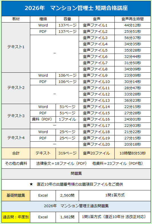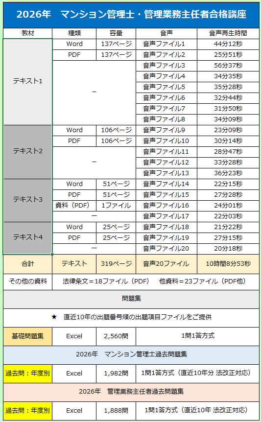 | 2026年4月にマンションに関する法律が大きく変わります。 今回の法改正は、全面改正と言っても良いほど、マンション管理や管理組合運営に大きな変化をもたらします。 今まで勉強してきた知識は使えなくなります。古い参考書、古い過去問題集を使っていたら、合格できなくなりますので、ご注意下さい!! ですが、これはチャンスでもあります! 多くの受験者が法改正事項が複雑すぎて、中身を正しく理解できていないからです。今まで何年も勉強をしてきた人もこれから開始する人も、2026年度試験ではスタートラインは同じ。 アドバンテージもハンディキャップもありません。更に複雑な法改正が施行される前に取得を希望した優秀なライバル達が多かったため、2026年試験は正に穴場です。 勉強方法さえ間違わなければ、比較的容易に上位へ行くことが可能です。 制度を正しく理解できた人だけが合格できます。つまり、正しく理解できる教材で勉強した人が勝者になることができるのが、2026年度試験です!! 例えば、今までこの試験を受験した方であれば、以下のような問題を「正しい」と判断するでしょうが、2026年4月以降はすべて「誤り」となります! 「何故、間違いなの?」と、少しでも思った人は黄色信号です。知識のアップデートが必要です。しかし、ご安心下さい。弊社が全てお教えてします。 【令和8年3月までは正解、4月以降は不正解になる一例】 ★ほんの一例に過ぎません。 (問題) 集会の議事は、この法律又は規約に別段の定めがない限り、区分所有者及び議決権の各過半数で決する。(〇)→(×)に変更 (問題) 建物価格の2分の1を超える建物の一部が滅失したときは、集会において、区分所有者及び議決権の各4分の3以上の多数で、滅失した共用部分を復旧する旨の決議をすることができる。(〇)→(×)に変更。 (問題) 集会の招集の通知は、会日より少なくとも一週間前に、会議の目的たる事項を示して、各区分所有者に発しなければならない。ただし、この期間は、規約で伸縮することができる。(〇)→(×)に変更 (問題) 共用部分の変更(その形状又は効用の著しい変更を伴わないものを除く。)が決議事項であるときには、その議案の要領をも通知しなければならない。 (〇)→(×)に変更 (問題) 規約の設定、変更又は廃止は、区分所有者及び議決権の各4分の3以上の多数による集会の決議によってする。この場合において、規約の設定、変更又は廃止が一部の区分所有者の権利に特別の影響を及ぼすべきときは、その承諾を得なければならない。(〇)→(×)に変更 ![]() ★ 会員:新規会員様 継続:弊社の他教材もご利用されている方 ★ 法人様が社員分をまとめてご購入される場合もございます。 ![]() この試験は、あなたの成績だけでは、合格が決まりません!勘違いされている方が結構いらっしゃいます。 一定基準をクリアできた人を合格させる試験ではなく、あらかじめ設定された上位成績者割合の中で合格者を選定、調整しています。 ・マンション管理士合格者は、8%〜12%内(毎年変動) ・管理業務主任者合格者は、18%〜23%内(毎年変動) 競争試験ですので、あなたが自分の成績に満足していても、それをライバルたちが超えてしまうと、あなたの合格の夢は阻まれます。 ライバルたちに勝てる知識と受験テクニックが求められます。それらを弊社がご提供致します!! ライバルに勝つには、ライバルより早く学習を開始し、彼らを圧倒的に引き離す知識や情報を習得しなければいけません!! ![]() ![]() |