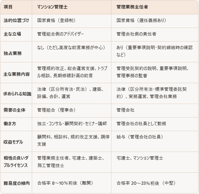 挑戦するにあたり、先生より、マンション管理士は難しいから、先に管理業務主任者資格を取得し、翌年のマンション管理士試験の5点免除を得たほうがマンション管理士の合格率はあがるというアドバイスに従いました。実際に勉強してみるとマンション内の細かいルールを学ぶ必要があり、宅建士とは全く違う内容に最初は困惑しました。