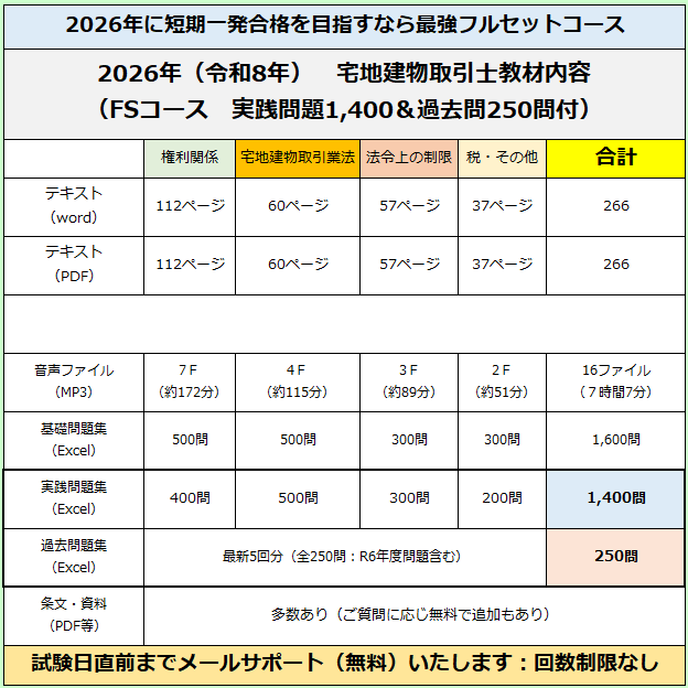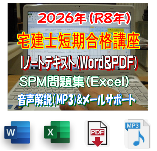 短期合格教材「Iノートテキスト」と「SPM問題集」は、Microsoft社のWordとExcel および、Adobe社のPDFファイルで作成されています。 テキストを解説した音声(MP3ファイル)も付いています。講師による直接指導は、メールを介して受けることができます。 講師である井真井が、19日間で合格するために作り上げた教材です。 正直、合格だけを目的に作った教材ですので、試験に合格することだけを目的とした人に使っていただきたい教材です。 Office(Excel,Word)搭載のPC等であればご利用いただけます。互換ソフトでも可能です。ソフトが入っていない場合には、弊社までご相談ください。 ![]() ![]() ダウンロード商品、またはダウンロード商品と同一のファイルを収録したCD郵送商品のどちらかをご選択いただけます。 ダウンロード商品をお申込みいただき、決済が完了しますと、ダウンロード専用ページ(URL)を、ご注文時に記載いただいたメールアドレス宛にご案内いたします。 お客様のパソコン等に直接、ダウンロードページから商品をダウンロードしてご利用ください。 この教材をお求めいただいた後は、独学ではありません。ご不明な点は、ご質問いただくことが可能です。 ![]() テキストには直接、書き込みが可能です。 検索機能などの便利機能も満載です。編集加工も自由自在。加筆はもちろん、覚えた個所は削除したり、覚える個所を太字や拡大することもできます。 自分に最適なオリジナルテキストに加工できます。 「私がつくるテキスト」=「Iノートテキスト」と呼びます。 テキストには、学習しながら容易に確認ができるよう、各省庁などが作成したパンフレットやリーフレットなどに簡単アクセスするためのリンクが数多く設定されています!! 最新の正確な情報を入手できるだけでなく、煩雑な確認作業を短時間で行うことができ、タイパに優れています。 ![]() ![]() Excelで作成された「SPM問題集」は、今日まで数多くの宅建士を誕生させてきた実績のある問題集です。 一問一答式で作成され、基礎問題だけでも1,600問あります。 半世紀以上にわたり実施されている宅建試験において、あらゆる問題パターンを網羅した最強ツールです。 合格に特化した問題集であり、合格に必要な知識が迅速に習得できるため、『speed masters』と『supreme method』から「SPM」と名づけました。 使い方は簡単です。 問題文を読み、正しいと判断した時は、解答欄に「1」を、間違っていると判断した時は、解答欄に「2」を入力するだけです。 その判断が正しければ「○」、誤っていれば「×」が表示されます。 あなたがどの問題を正解でき、どの問題を誤ったかが一目瞭然 苦手個所の把握ができますので、復習時間をどの問題に費やすのが最善策なのかが、わかります。 一問ごとに正確な理解が求められるため、どんな応用問題で出題されても対処できるようになります。 1日に同じ問題を3回繰り返すことを推奨しています。 それにより、記憶の刷り込みができ、長期間にわたり、記憶し続けることが可能となります。 せっかく、覚えても、忘れてしまったら意味がありませんので、記憶からの喪失防止のために、必ず同日、同問題を3回、繰り返してください。 問題の右隣セルにカーソルをあてると、解説が飛び出してきます。 解説は、一問、解くごとに確認するのではなく、一定数の問題を解いた後に、間違った個所のみ確認してください。 最初は正解できなくても構いませんし、気にすることもありません。 自分はどのような問題が得意で、どのような問題が苦手なのか? これを把握できた人が、合格の見込みがある人です。 ![]() 連続3回正解で解答欄が黒塗りに。そのような問題は復習回数を減らしても大丈夫。総合点アップのためには、黒塗りできていない問題を中心に復習します。 ![]() SPM問題集は、次のステップを順番に踏んでください。 1・設問が正解なのか、誤りなのか、判断できるようにする。 2・設問が何故、正解(不正解)なのか、判断根拠を確認する。 3・解説を読んで、理解を深める。 4・自分にとって正解するために必要なことを書き込む。 5・連続3回正解できるようにする。 設問 ⇒ 解説 ⇒ 解答 ⇒ 正誤判断 といったように、各問ごとにすべて横一列に配置されています。これが集中力を持続させ、記憶力を増幅させます。 問題文とのリンク性が強くなるため、頭の中の整理も容易になります。 勉強で大事なのは、『覚えること』と『忘れないこと』。 これを同時に満たす勉強方法が、SPMです。 ⇒ 講座のお申し込み&価格確認はこちら |